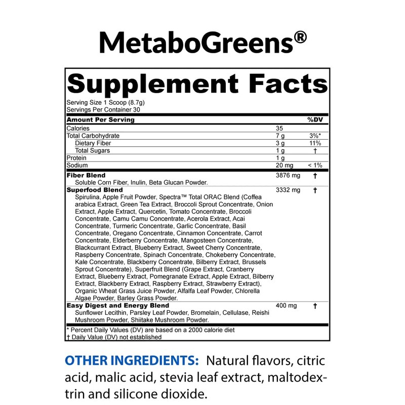 - SUPERFOOD BLEND. MetaboGreens contains only the finest naturally-sourced ingredients, combining an energizing blend of more than 40 phytonutrient-rich raw greens, fruits, veggies, herbs, and spices into the world’s most delicious superfood blend!