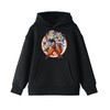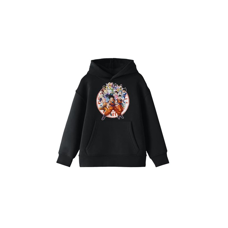 Celebrate the super saiyan heroes with this Dragon Ball super sweatshirt. The hoodie features Goku, Goten, Trunks, Piccolo, Vegeta, Krillin, and other characters gathered in front of a white circle with red designs. The sweatshirt comes in black with a double-lined hood and a large pouch pocket. Fans of the anime will love to find their favorite characters in this design.