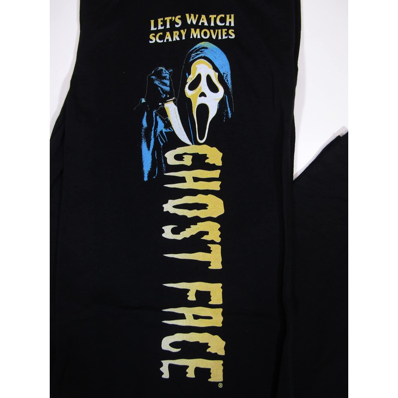 - GRAPHIC DESIGN: Ghostface appears on the left leg of these men's pants as yellow text above the scary figure reads, "Let's watch a scary movie." Ghostface's name is printed below in sideways yellow letters.