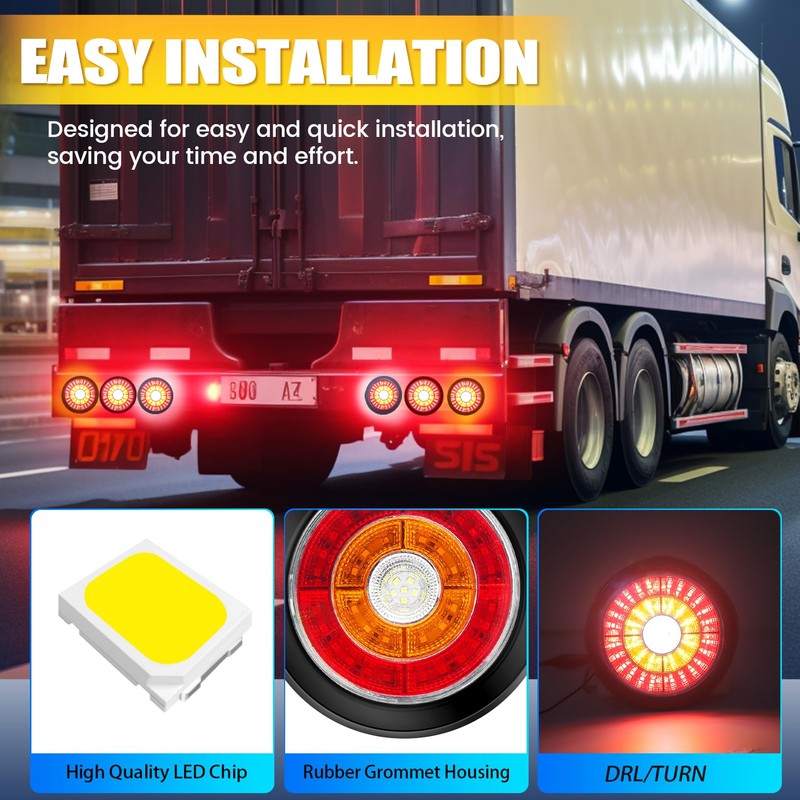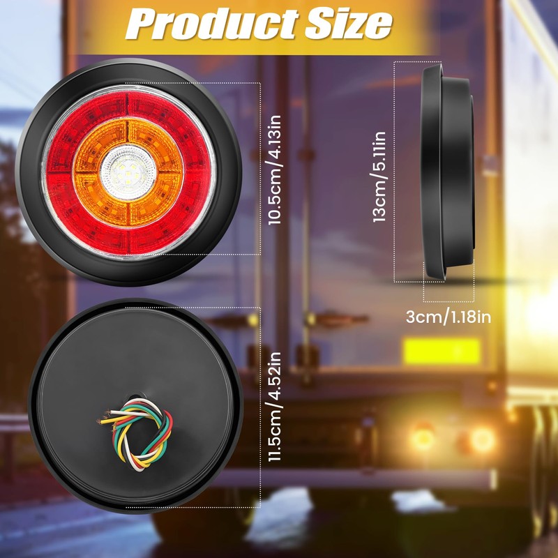 - ⚡【4 IN 1 Round Trailer Light】Multifunctional taillights integrate functions such as brake light/running/turn signal/reversing light.With high brightness, wide irradiation angle, fast heat dissipation. The service life is more than 50,000 hours. Vehicles behind can easily see your light changes, making travel safer.
