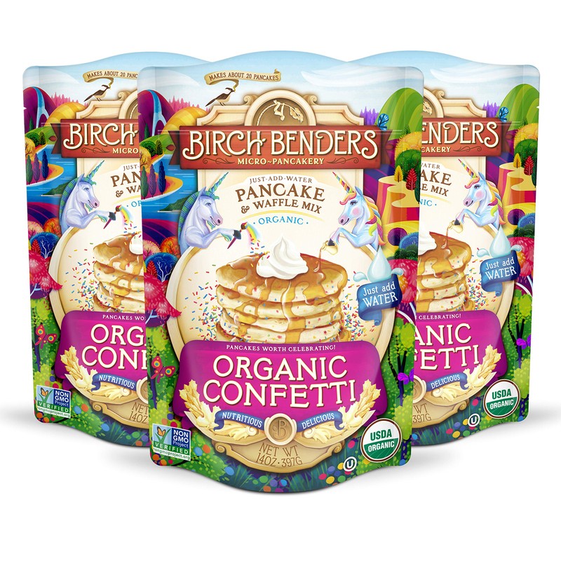 - 3-Pack of organic confetti pancake and waffle Mix.