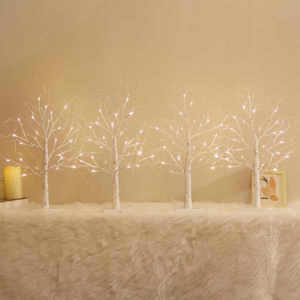 Birch Tree with LED Lights Set of 4, Lighted Birch Tree Battery Powered/USB, 24 LED Warm White Tree, 2FT Small Flickering Christmas Tree Decor for Indoor Home Mantel Winter Christmas Decorations
