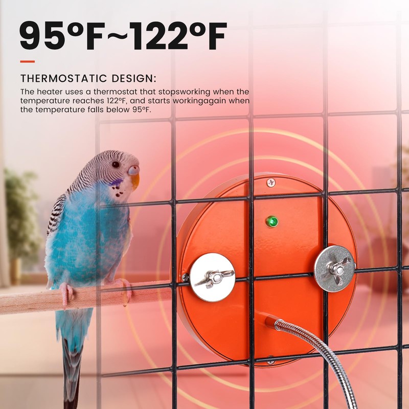 - The heater has a thermostat that interrupts operation when the temperature reaches 122°F and resumes operation when the temperature drops below 95°F. Even in cold weather, the bird cage heater remains at 95°F-122°F and provides a warm and comfortable environment for parrots to cuddle