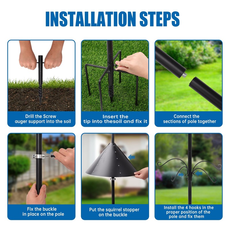 • ✿EASY INSTALLATION:This Bird Feeding Station is very easy to install, Five simple steps you can assemble it by yourself in 5-10 minutes! First Secure the 5-Prong base in the soil, attach each pole section, then secure the buckle and squirrel baffle , install the four shepherd hooks, and finally fix the top mounting platform.We guarantee 30 days money back and one year replacement policy. Please feel free to contact us.