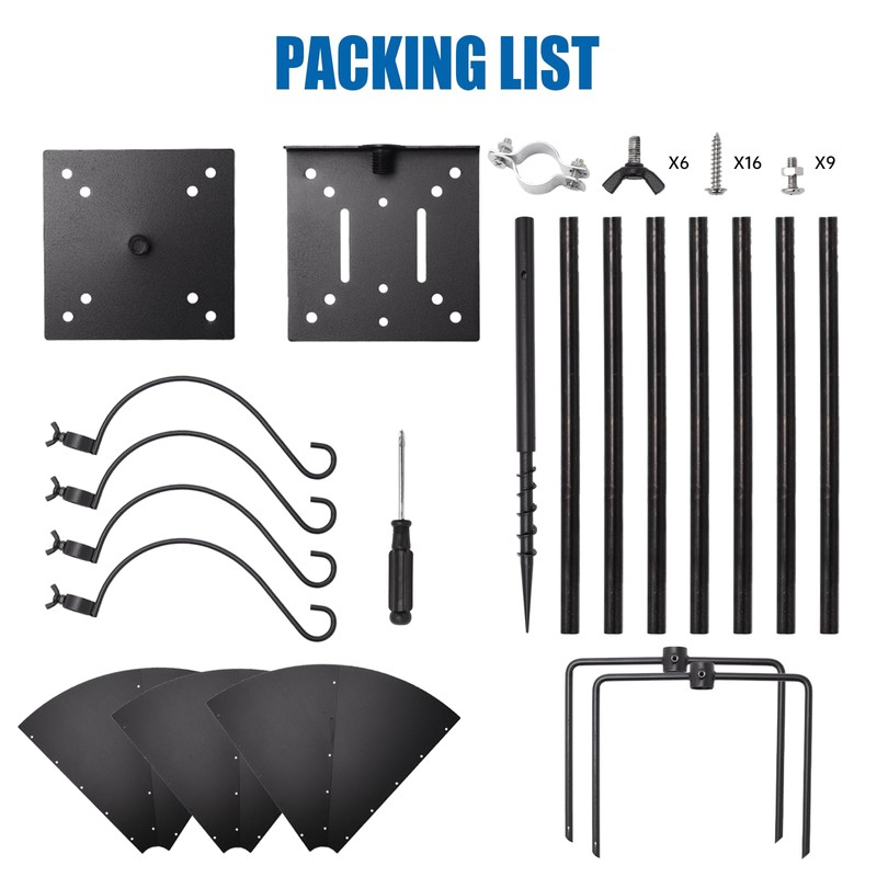 • ✿DURABLE CONSRTUCTION:The heavy duty bird feeder pole includes a 5-prongs base, 2 types of mounting platform, 8 pole sections and a 15.5-inch squirrel proof baffle, 4 7.5-inch shepherd hooks, which provides more space for you to freely build a small bird ecosystem. It is made of high quality metal material with black rustproof coating, which can be used outdoors for a long time without worrying about rusting due to rain.(NOTE:Bird House/Pendants Not Included)