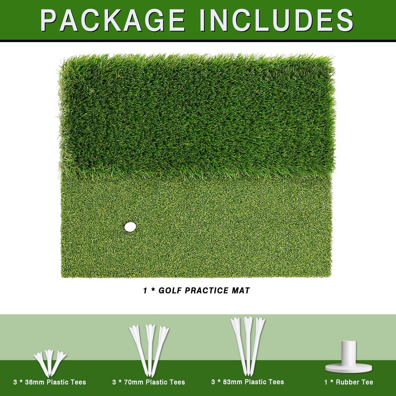 - PACKAGE INCLUDES: 1 * Dual-Turf Golf Mat, 3 * 38mm Plastic Tees, 3 * 70mm Plastic Tees , 3 * 83mm Plastic Tees, 1* Rubber Tee.