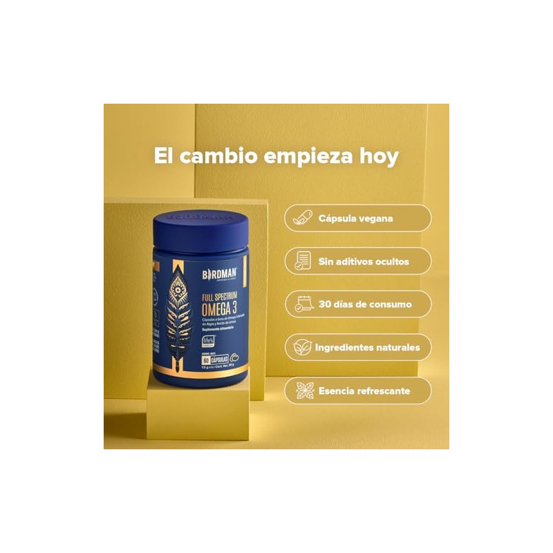 BIRDMAN - Birdman Full Spectrum Omega 3 a base de Algas y Aceite de Linaza | Fórmula 100% Vegetal y Sostenible | Libre de Contaminantes y Aditivos | Suplemento Alimenticio | 30 Porciones | 60 Cápsulas. ✅ Diseño innovador que supera las expectativas. Tecnología avanzada y rendimiento superior. 💝 Perfecto como regalo especial. Ideal para quienes buscan lo mejor en calidad y estilo. Producto auténtico con satisfacción total asegurada. ¡No te quedes sin el tuyo y aprovecha esta oportunidad única!