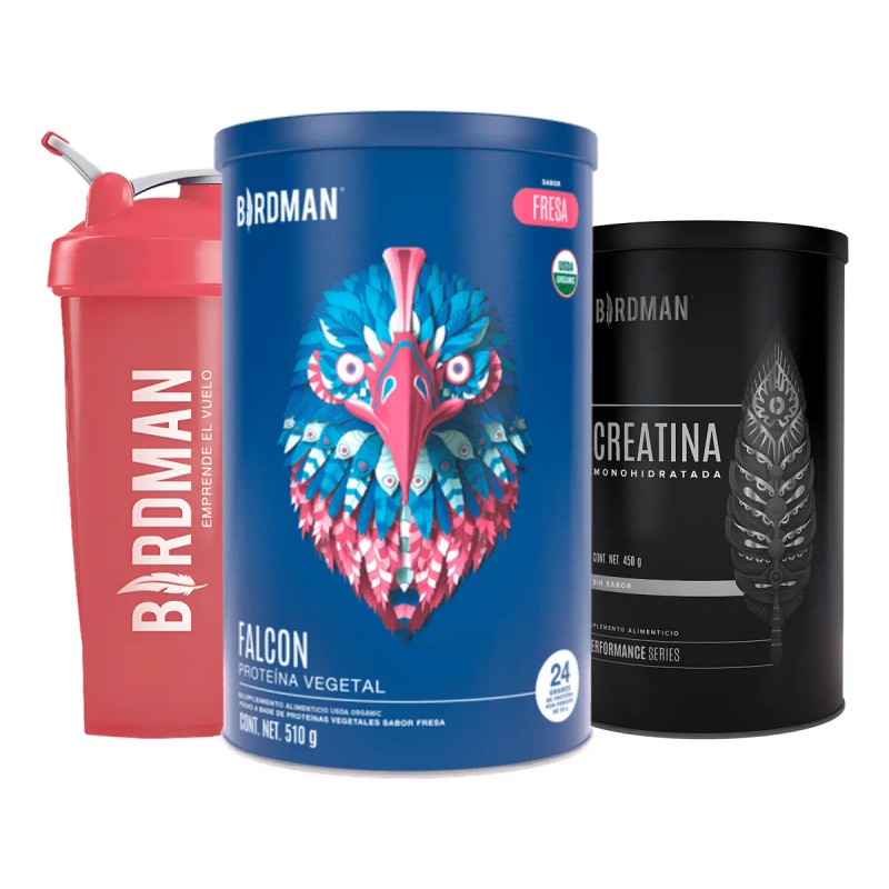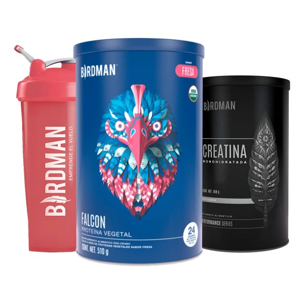 • PROTEÍNA VEGETAL FALCON BIRDMAN Falcon Protein es una proteína 100% vegetal con cadena de aminoácidos completa gracias a su sinergia de 7 fuentes de proteína. Además, contiene una mezcla de enzimas y probióticos. Cada porción de 30 g aporta hasta 24 g de proteína vegetal, es libre de azúcares, gluten, soya y posee certificados USDA Organic y Kosher. Falcon Protein está diseñada para apoyar tu ingesta de nutrientes diarios y está disponible en sabores orgánicos de chocolate y vainilla. Este producto no está destinado a diagnosticar, tratar, curar o prevenir ninguna enfermedad. Consulta a tu médico o nutricionista para asesoría personalizada. INGREDIENTES: Proteína de arroz orgánica Proteína de chícharo orgánica Proteína de quinoa orgánica Proteína de semilla de calabaza orgánica Proteína de semilla de arándano orgánico Proteína de sacha inchi orgánica Amaranto orgánico Alga Lithothanium Calcareum (Minerales traza) Enzimas (papaina, bromelina, protease fúngica, peptidasas) Goma (guar, xantana, arabiga) orgánica Probióticos (Bacillus Coagulans) Stevia orgánica Canela orgánica Sal rosa del himalaya Instrucciones para su conservación, uso y preparación: Mezcla 1 porción con 350ml de agua o leche vegetal. También la puedes añadir a tus smoothies o licuados. Una vez preparada la bebida, refrigerar y consumir el mismo día. Mantener en un lugar fresco y seco lejos de los rayos del sol. CREATINA MONOHIDRATADA BIRDMAN 450G Nuestra Creatina Monohidratada será la mejor aliada para tu estilo de vida. Micronizada y de alta pureza, te ayudará a complementar tu rutina diaria y apoyarte para alcanzar tus metas. Además, es completamente libre de saborizantes y endulzantes por lo que puedes agregarla a cualquier bebida sin cambiar su sabor. Este producto no está destinado a diagnosticar, tratar, curar o prevenir ninguna enfermedad. Consulta a tu médico o nutricionista para asesoría personalizada. La Creatina ocurre naturalmente en nuestros cuerpos y es crucial para los niveles de energía de nuestro metabolismo. Cuando necesitamos energía, convertimos ATP (adenosin trifosfato, el "combustible" de nuestras células) en ADP (adenosin difosfato). Eventualmente nuestro cuerpo convierte este ADP en ATP de nuevo usando la energía que obtenemos de nuestros alimentos. Para veganxs y vegetarianxs. Las fuentes más comunes de creatina tienden a ser de origen animal, por lo que es relativamente común que personas con dietas veganas o vegetariana tengan bajos niveles de creatina, comparándolo con personas con dietas omnívoras. Aviso legal