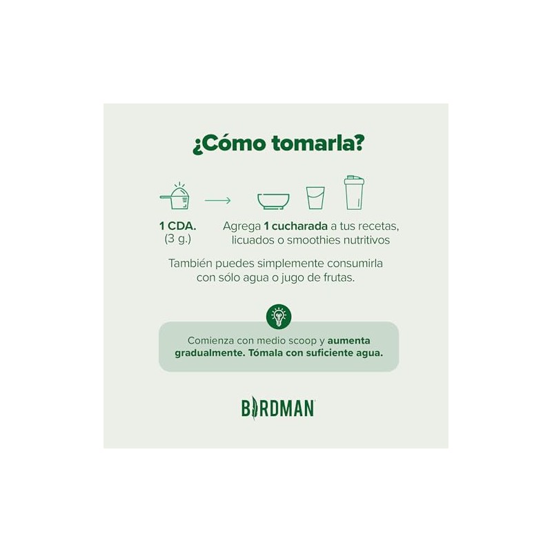 Birdman Spirulina en Polvo con Vitamina A, Vitamina K1, Zinx, Ficocianina, Clorofila, GLA, Zeazantina y Hierro, 360gr