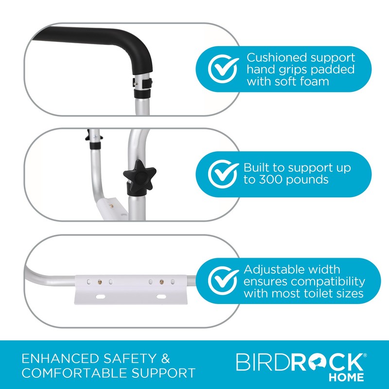- STURDY CONSTRUCTION: Built with high-quality aluminum, BIRDROCK HOME Toilet Safety Rail ensures durability and long-lasting use. The non-slip handles provide extra security for elderly and disabled users, making bathroom activities safer.