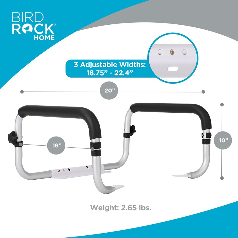 - DIMENSIONS: The BIRDROCK HOME Toilet Safety Rail measures 18.75-22.4" in width (adjustable), 16" in length, and 10" in height, weighing 2.65 lbs. It supports up to 300 lbs, providing reliable assistance and enhancing bathroom safety for users.