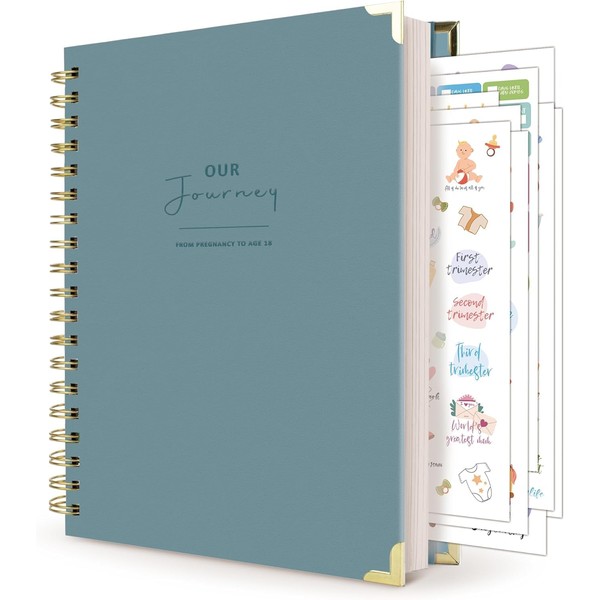 - High Quality: To make your precious memories stand the test of time, durability is our shared concern! The BIROYAL pregnancy memory book features metal corner protectors on the cover, 320 pages of 100gsm leak-proof inner pages that are made to last. The pregnancy calendar also has a pocket on the back for storing documents or photos. Our product includes 9 baby stickers, each filled with love and warmth, to help you decorate your baby book.