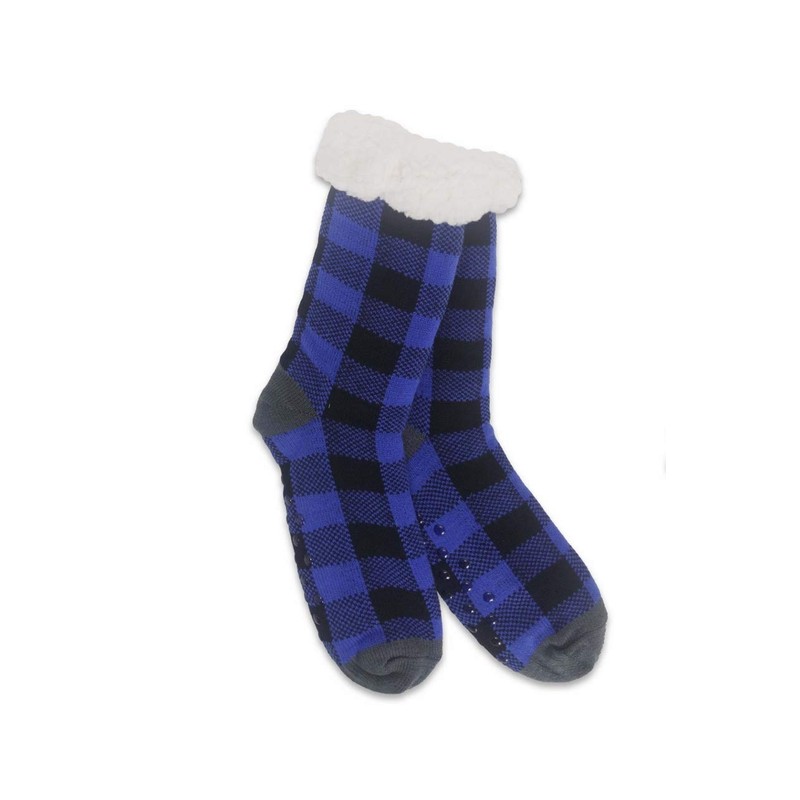 Birsppy Mirabeau Buffalo Plaid Sherpa Thermal Knit Slipper Socks with Non-Slip Grippers (Adult/Youth Blue Check/Gray Toes-Buffalo Plaid)