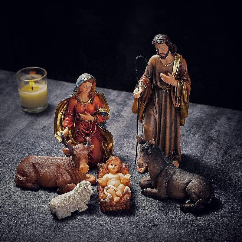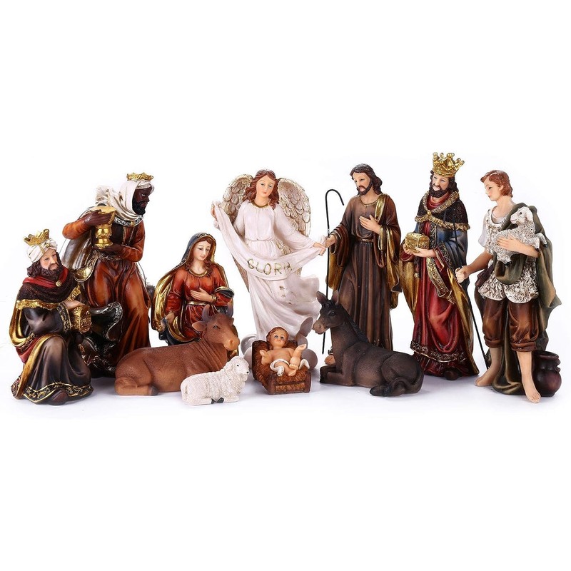 - 8.5 inch tall set of 11piece Christmas Nativity set indoor. Hand painted with bold colors and realistic detail; Made of highest quality Durable resin stone. , This inspired Nativity statue gives true reason to celebrate the meaning of the season.