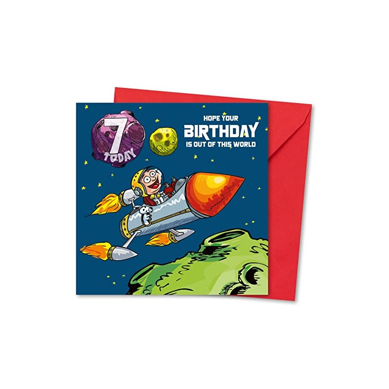 Birthday Card for Boy Age 7. Birthday Card with Matching Envelope. Space Rocket design. Card size 148x148mm. Eco-friendly. Message inside. Printed and Packed in UK.