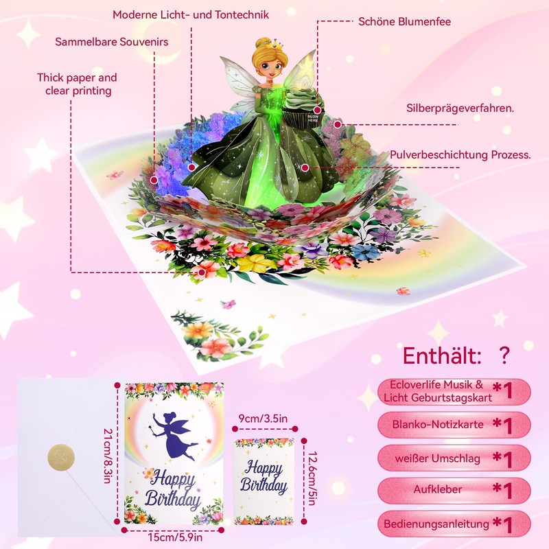 - 3D POP UP BIRTHDAY CARD DESIGN This music birthday card has a pop up design. When you open it, you see a girl surrounded by flowers holding a cake in her hand. We also used the glitter technique to make the card look shiny, making it the best birthday card for girls.
