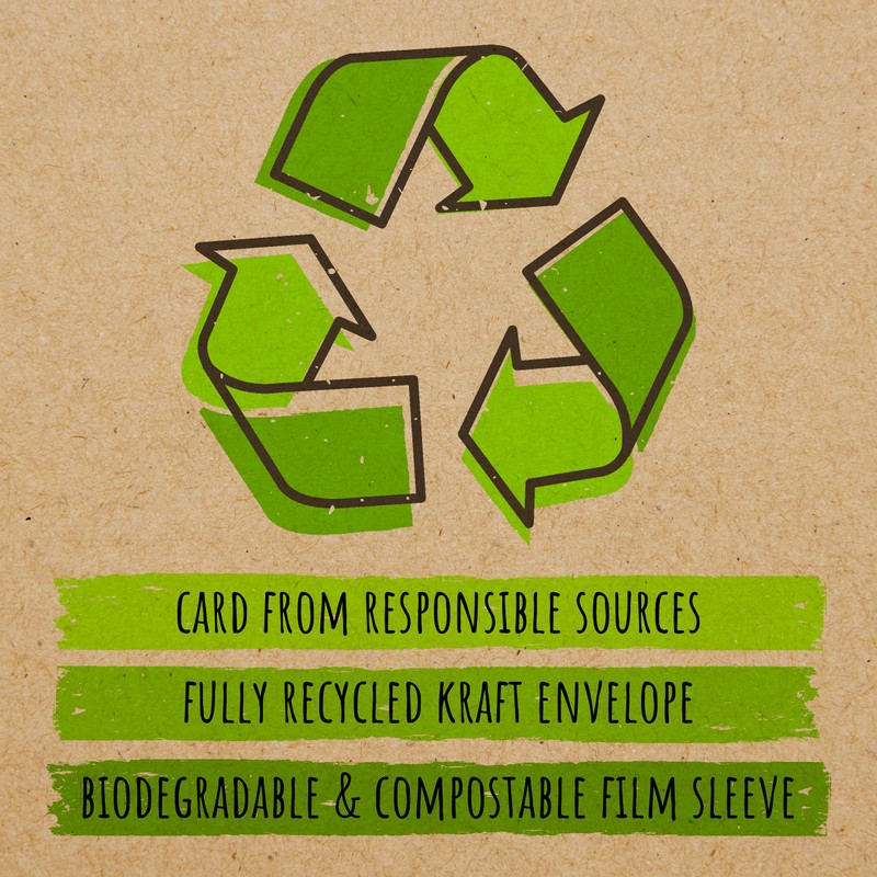 - Planet Friendly - We use only card from sustainable sources and our envelopes are made from recycled kraft paper. Our protection sleeves are 100% biodegradable and compostable, so that you can be assured that everything you will receive through the post is 100% recyclable.