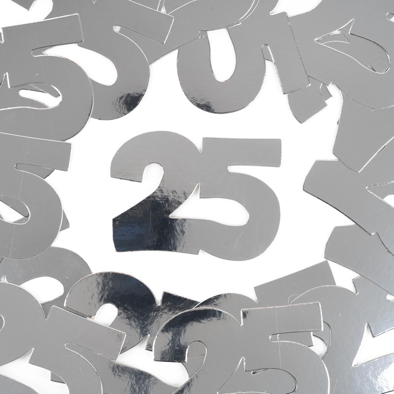 - The perfect fun party decoration: 20 confetti "25" with the dimensions 10 cm x 7 cm made of paper, glossy silver printed. A real eye-catcher for birthdays, silver weddings and anniversaries