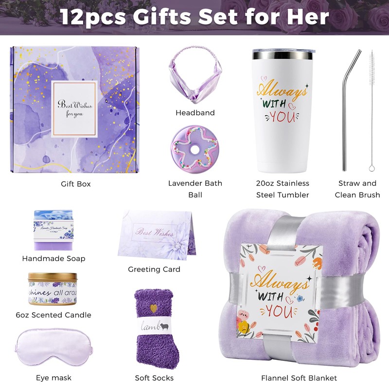 - DESIGNED FOR RELAXATION: Each of these gifts for women are designed for relaxation. Take a bath with beautiful lavender smells and then curl up with a favorite drink under the soft flannel blanket.
