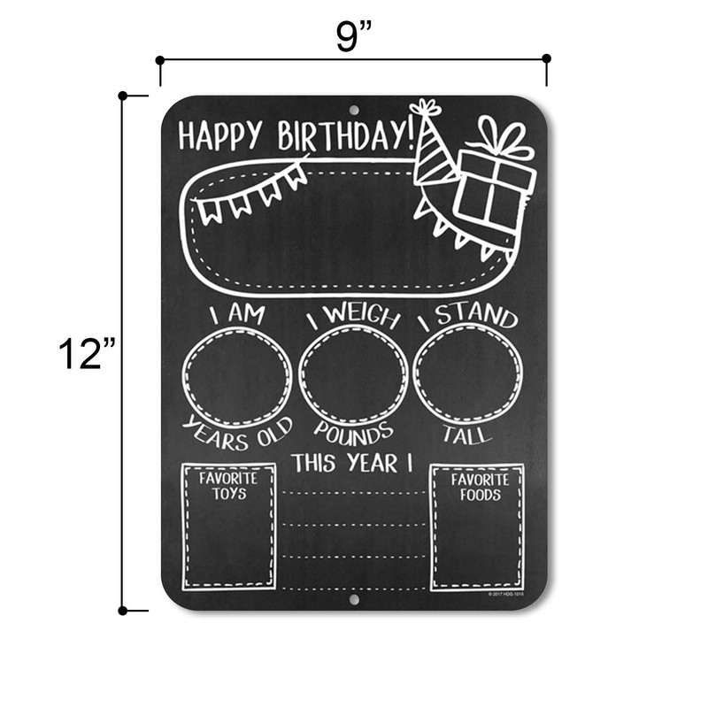 - This baby birthday milestone board photo accessory is made of durable and lightweight tin metal. It measures 9 inches by 12 inches - the perfect size for any photo-shoots. This baby milestone chalkboard sign has pre-drilled holes for easy hanging and display.