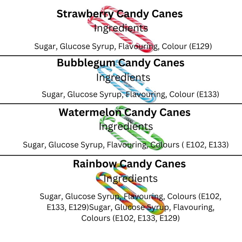 - Enjoy a delightful mix of flavors with this Assorted Candy Canes Gift Box, featuring 12 delicious candy canes in four exciting flavors: Strawberry, Watermelon, Bubblegum, and Rainbow (3 of each)