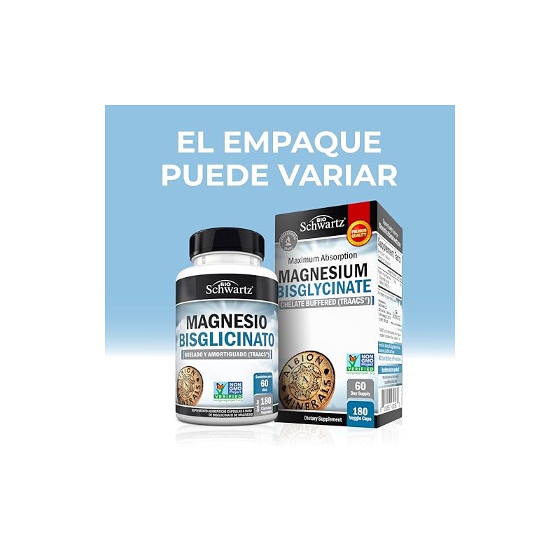 Acerca de este artículo Minicápsulas fáciles de tragar: BioSchwartz ha desarrollado un suplemento de magnesio bisglicinato puro en cápsulas pequeñas y fáciles de ingerir, formulado sin aglutinantes, rellenos ni aditivos químicos. Fórmula suave y sin efecto laxante: Esta fórmula vegana y vegetariana es bien tolerada, con cápsulas diseñadas para una absorción óptima y alta biodisponibilidad, sin causar efectos laxantes. Potente y con múltiples beneficios: El bisglicinato de magnesio es una forma comúnmente utilizada como parte de una dieta balanceada, con uso tradicional en el apoyo al funcionamiento normal del cuerpo. Alta biodisponibilidad: Formulado con Albion TRAACS, una forma patentada de magnesio biodisponible que garantiza una máxima absorción. La diferencia de calidad de BioSchwartz: Nuestros suplementos alimenticios de calidad profesional se fabrican en EE.UU. con ingredientes de la mejor calidad procedentes de todo el mundo, siguiendo estrictas pautas de las BPM para garantizar que se obtengan los mayores beneficios.