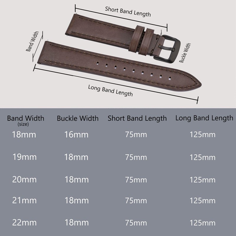 - Choice of sizes: available in 18 mm, 19 mm, 20 mm, 21 mm and 22 mm. Please measure the lug width of your watch accurately and choose the right size. Size = width of the watch lug