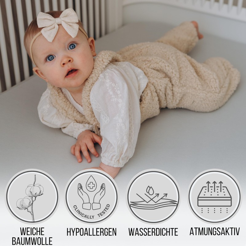 - Waterproof: Under the jersey layer there is a waterproof polyurethane membrane. Thanks to this invention, we can protect baby's sensitive skin from irritation while not worrying about the mattress. The ability to wash them at 60°C in the washing machine helps with adequate disinfection and prevents the growth of bacteria and mites.