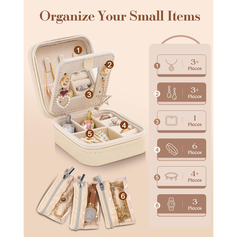 - Built-in Mirror: A mirror is thoughtfully integrated into the design of this jewelry travel case, allowing you to effortlessly check your jewelry and makeup wherever you are.
