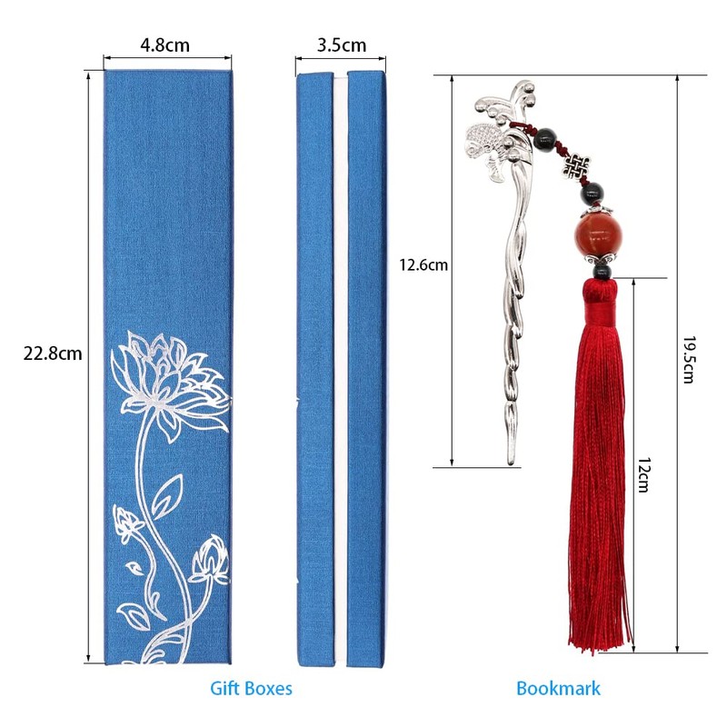 - Reading Mark Parameters: Bookmark Weight: 26g; Metal Part Size:12.6 x 2.3cm; Tassel Length: 12cm; Gift Box: 22.3 x 4.8 x 3.5cm (55g); Book Page Holder:8 x 3.5 x 0.5cm (Inner Diameter: 2.1cm) (5g) Weight and size may vary slightly due to manual reasons.
