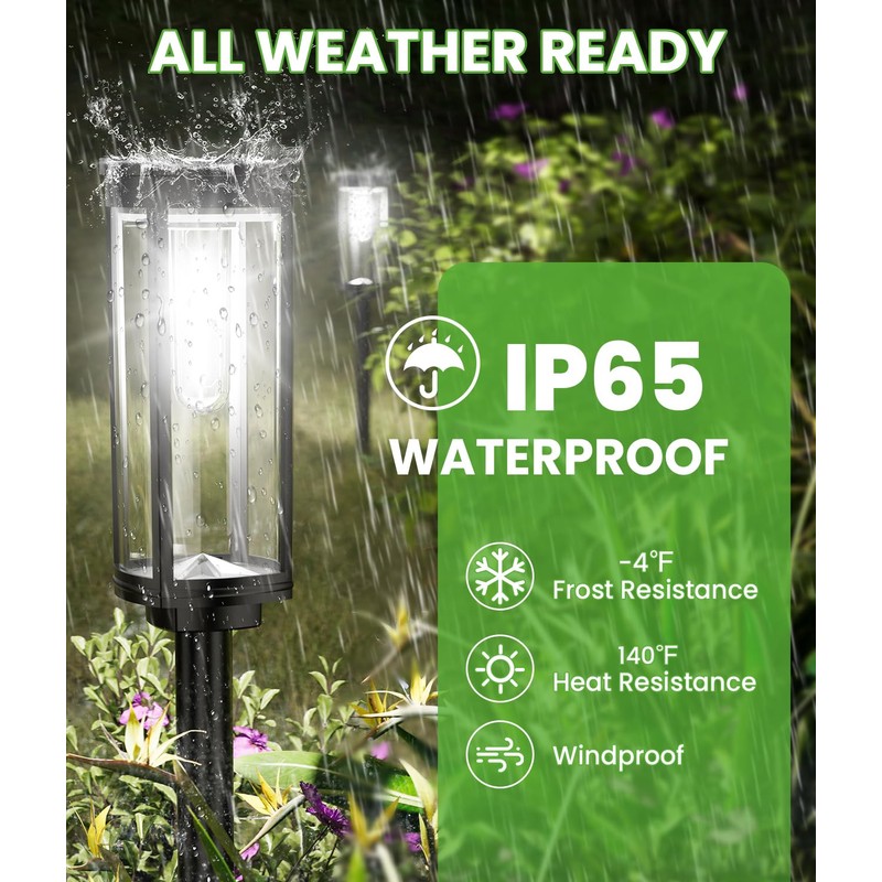 - ALL-WEATHER RESISTANT & EASY TO INSTALL: BITPOTT outdoor solar yard lights boast a high waterproof level of IP65, ensuring resistance to all types of weather conditions, including rain, snow, frost, and sleet. Constructed with high-resistance ABS plastic, they offer a longer service life. Installation is effortless; simply connect the stake, pole, and solar light, then insert the solar lights into the ground or lawn. Ensure these waterproof outdoor solar pathway lights are turned on before use and positioned where they can receive ample sunlight for optimal lighting.