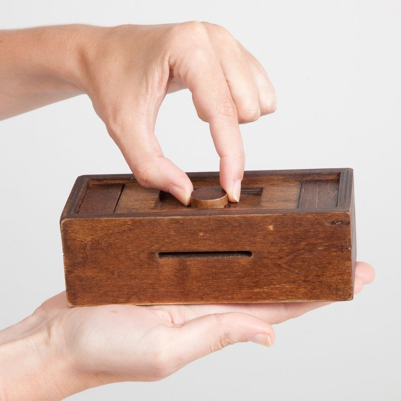 - Slide your coins and bills through the two slots on either side of this clever box, then look for the challenging solution to opening it.