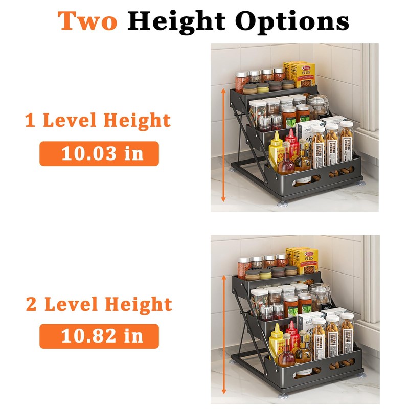- 【Adjustable 3-Tier Spice Rack Organizer – Two Height Options】This spice rack features an easy-to-adjust design with two height settings: 10.82 inches and 10.03 inches. It provides a spacious 3-tier storage solution with dimensions of 11.8 inches in length and 13.58 inches in width, accommodating different size of spice organizer.