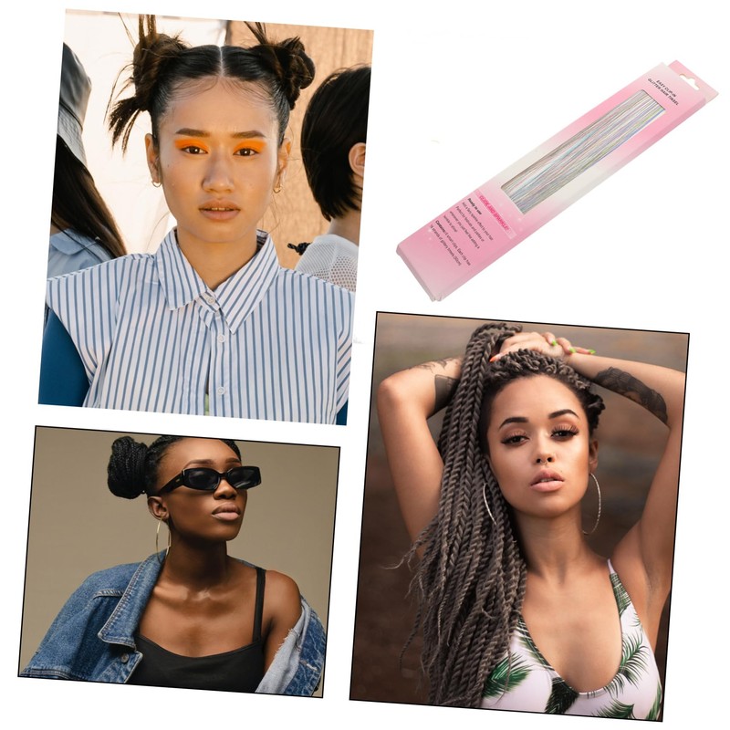 - Sparkly hair extensions: hair tinsel strands are shiny, allowed to dangle freely, creating a shimmering effect as the hair moves.