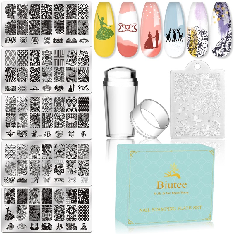 Biutee Nail Image Plate Set of 5 (5 Plate+1 Stamp+1 Scraper) Stamping Play Nail Art Tools