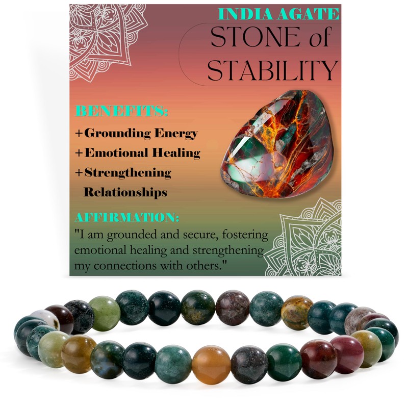 - Cultivate stability and grounding: the India Agate Stone Bracelet is known for its grounding properties. This multi-coloured gemstone promotes emotional resilience, making it ideal for mastering the changes in life. Wear it to promote stability and safety.