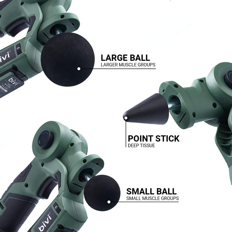 - ERGONOMIC COMPACT DESIGN: The BIVI Sports Massager helps to break up scar tissue and relieve muscle soreness and stiffness. Multiple attachments for full body massage. Perfect for upper/lower back, IT band, hip flexors, hamstrings, triceps, biceps, calves, feet and more.