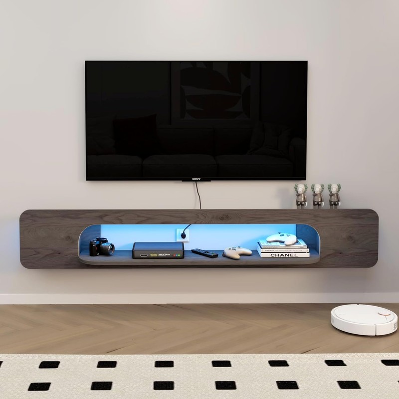 - [Strip LED Lights] The floating TV stand features 20 colors and 22 dynamic modes (flash, fade, smooth). This floating TV shelf with LED lights provides elegant lighting in warm and cool. The wall mounted TV stand will bring better entertainment experience for your family to watch movies and play games.