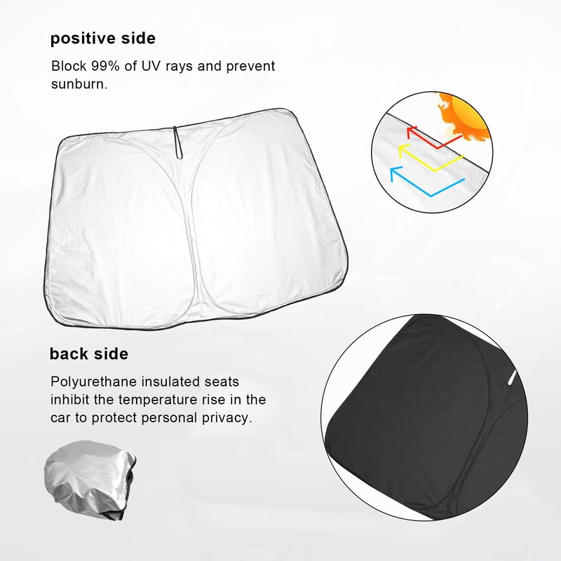 - 【High-tech material】: windscreen sun shade is made of high-quality, durable polyester material. With a reflective silver cover. It even blocks any glare on the edges of the screen with a unique flexible edge protection and can block the windscreen of the car with 99% solar heat.