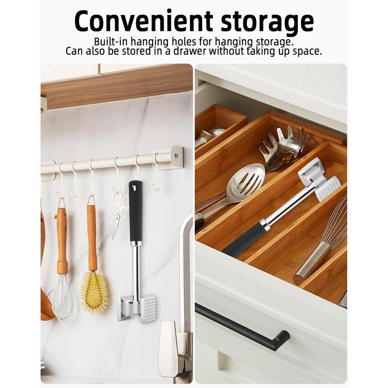 - Leicht Zu Lagern Und Zu Reinigen: Der Steakhammer hat ein eingebautes Aufhängeloch, Sie können den Steakhammer zur Aufbewahrung aufhängen oder in einer Schublade aufbewahren, ohne dass er Platz wegnimmt. Leicht zu reinigen, geben Sie den Steakhammer einfach in die Spülmaschine oder spülen Sie ihn gründlich mit Wasser ab