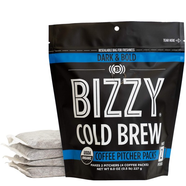 Bizzy Organic Cold Brew Coffee | Dark & Bold Blend | Coarse Ground Coffee | Pitcher Packs | 4 Count | Makes 2 Pitchers
