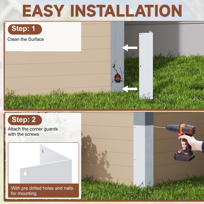 - Easy Installation: We equip the aluminum siding corners with pre drilled holes and nails for mounting,each package include 2pcs corner guards and hardware