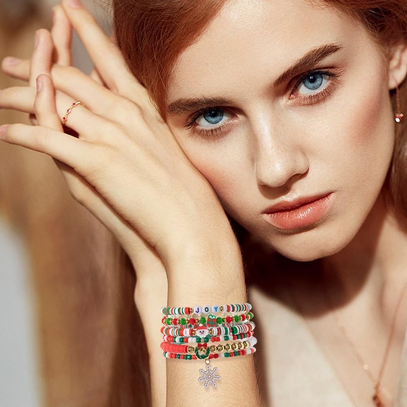 • Christmas ornament set: this set of Christmas bracelets offers a charming selection of designs, including snowflakes, Christmas gift boxes, elk, Christmas bells, Santa Claus and other holiday motifs. The bracelets are in classic Christmas colours such as red, white, green and gold and add a festive touch to any holiday outfit.