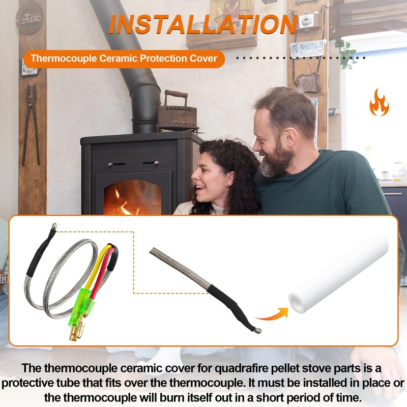 - INSTALLATION: The thermocouple ceramic cover for quadrafire pellet stove parts is a protective tube that fits over the thermocouple. It must be installed in place or the thermocouple will burn itself out in a short period of time.