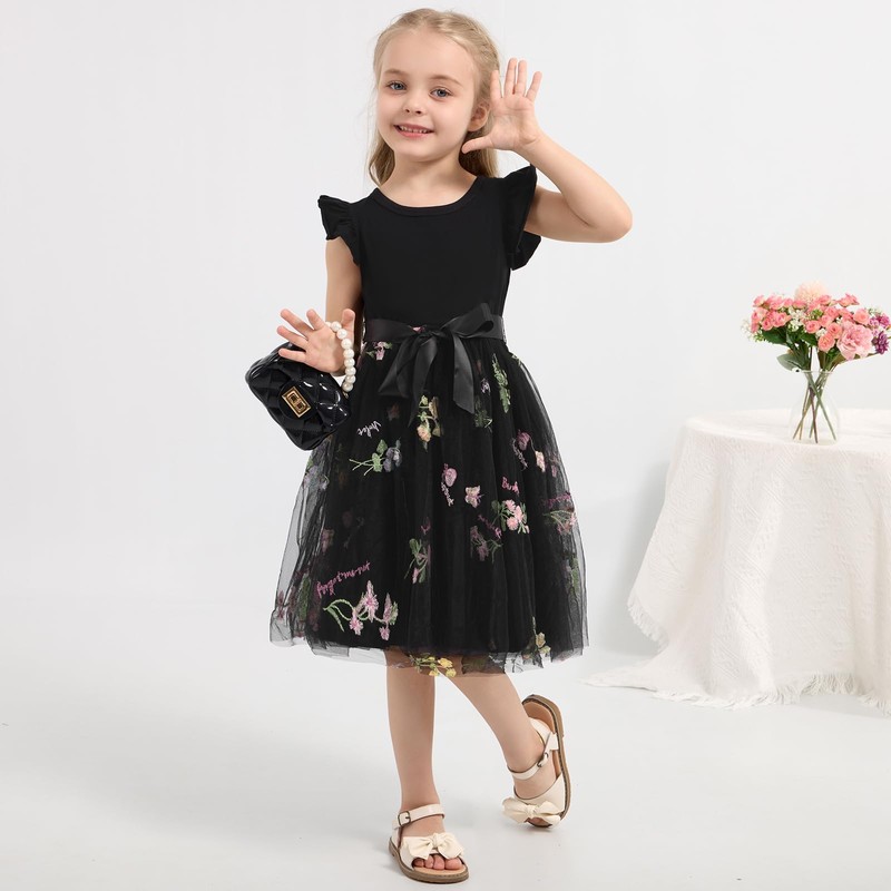 Bkixhv Toddler Girls Baby Tutu Tulle Dress Ruffled Sleeve Embroidered Floral Princess Party Dresses Summer Clothes 2-7Y Black
