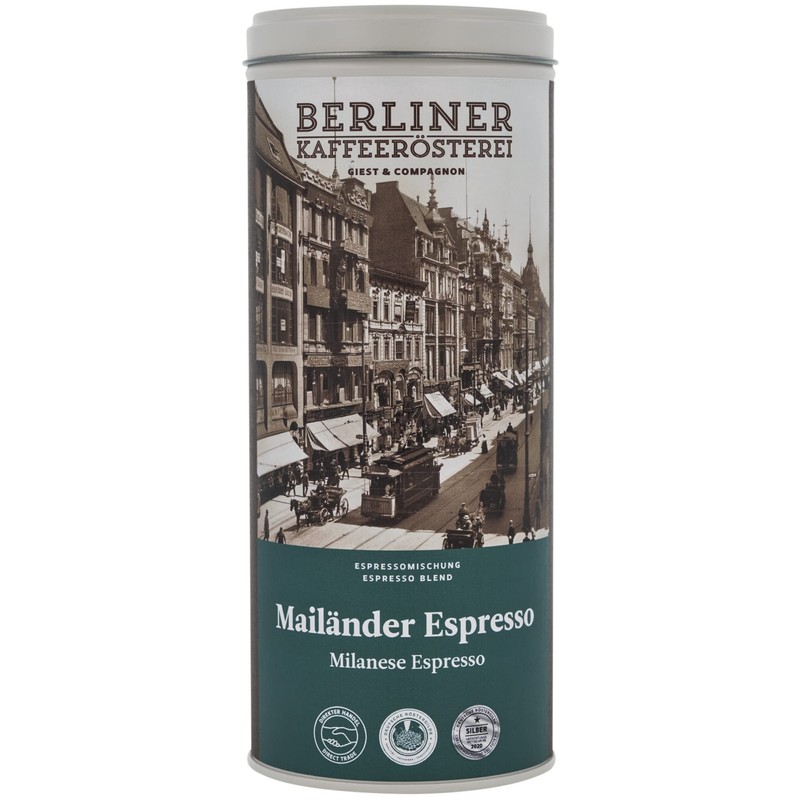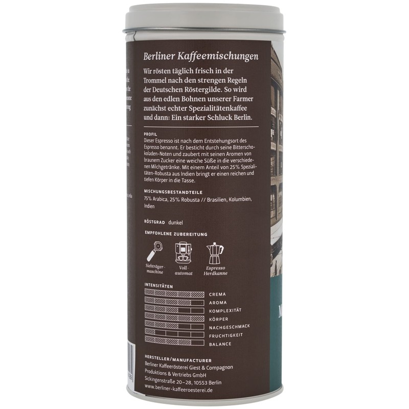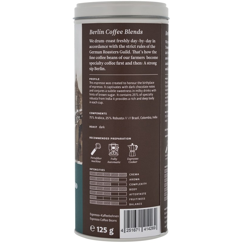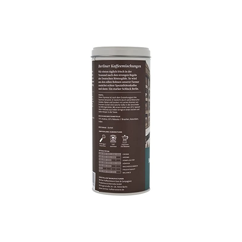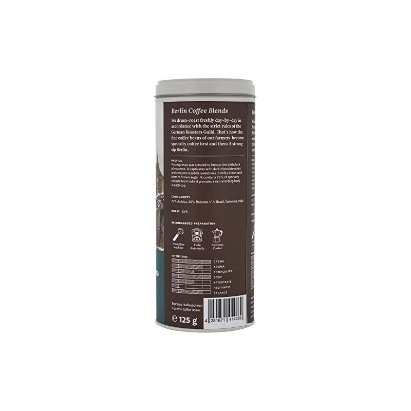 - Contents: Berliner Kaffeerroastei - Milanese Espresso (125 g/whole bean) with double lid can, roasting degree coffee: dark, 75 % Arabica beans, aroma profile: chocolatey/sweet