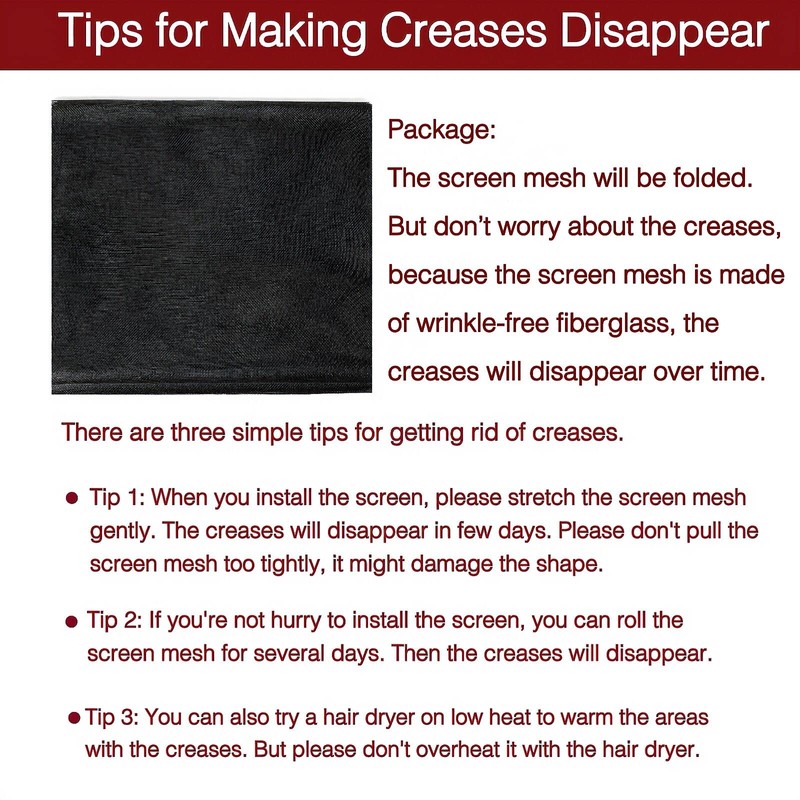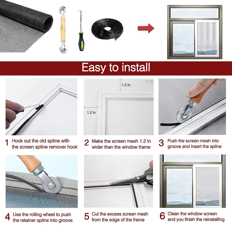 - - High Quality Screen Material: The Screen Mesh is made of fiberglass with high temperatur resistance and high tensile strength. Durable material and easy to work with.