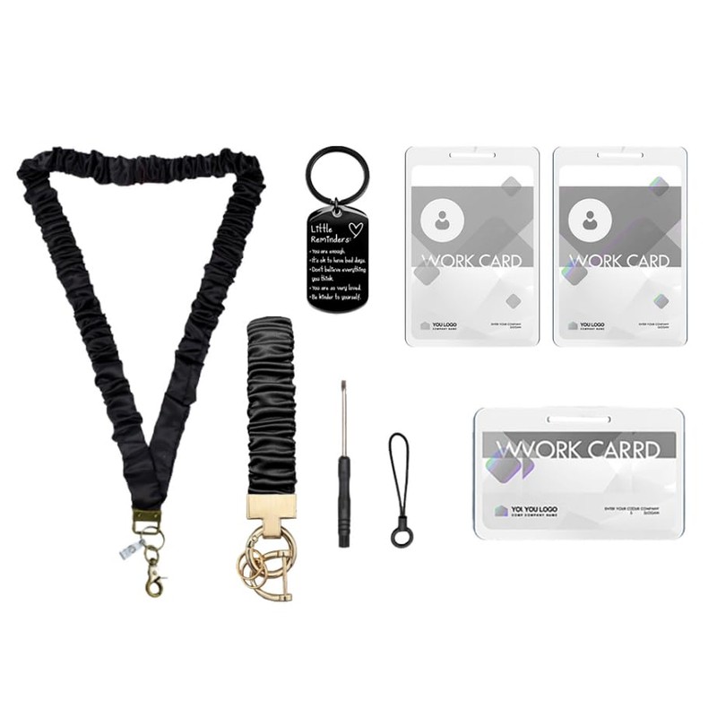 - High-Quality Stretchy Black Scrunchie Lanyard Made of skin-friendly polyester, this black scrunchie lanyard is soft, elastic, and comfortable for all-day wear. About 19.25 inches (49 cm) long, it stretches to fit different needs. Ideal for teachers, nurses, and parents, this scrunchie teacher lanyard keeps keys, ID badges, or phones handy without removing the strap.