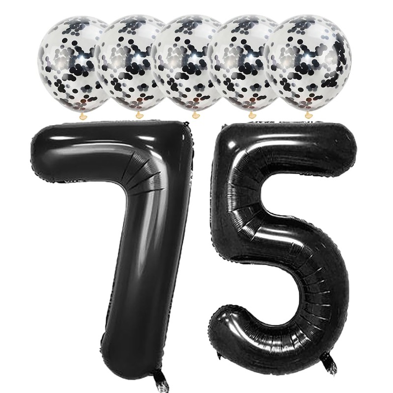 - 1 set black number "75" foil balloons ,5 pcs black confetti latex balloons,come with 10 glue points ,1 ribbon and 1 straw.
