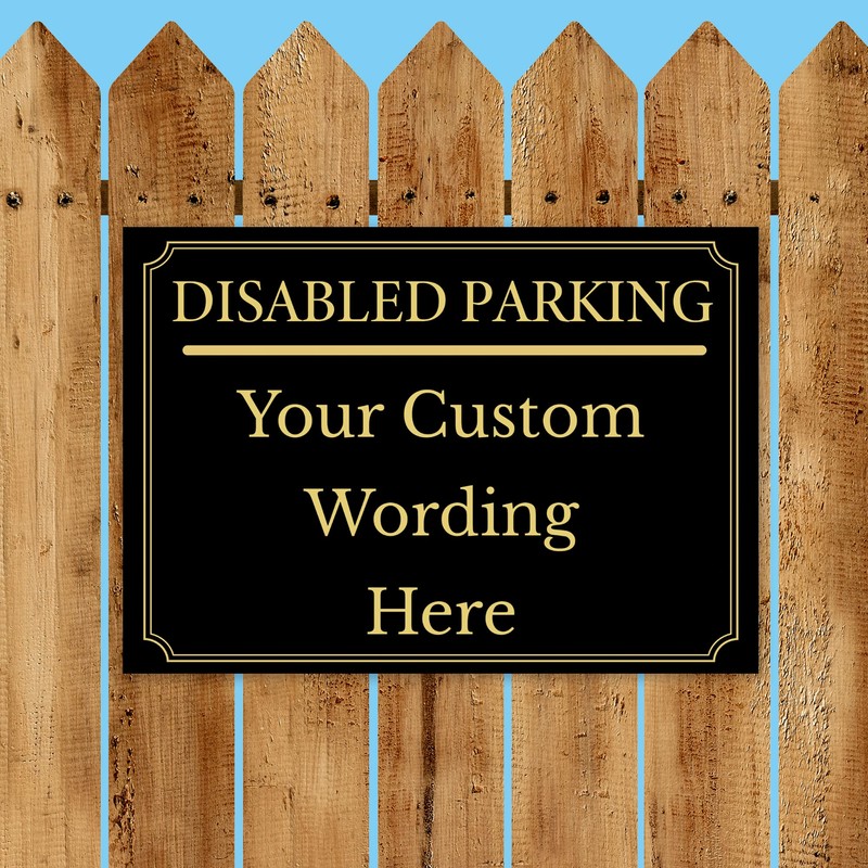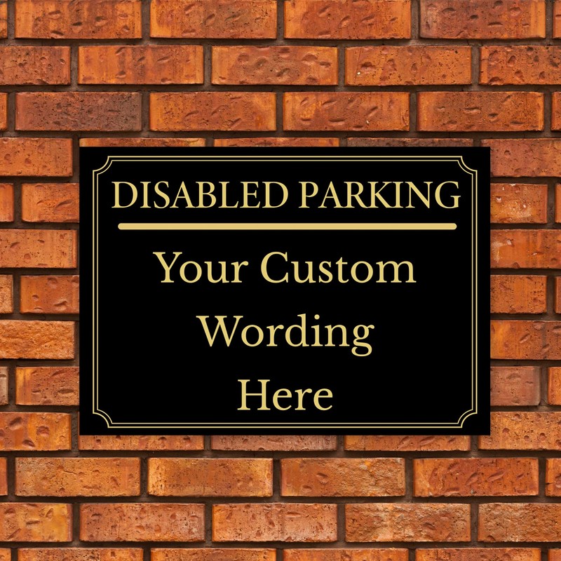 Black And Gold ‘DISABLED PARKING’ and a CUSTOM PRINTED MESSAGE, Warning Sign. Tough, Durable and Rust-Proof Weatherproof PVC Sign for Outdoor Use, No. 056